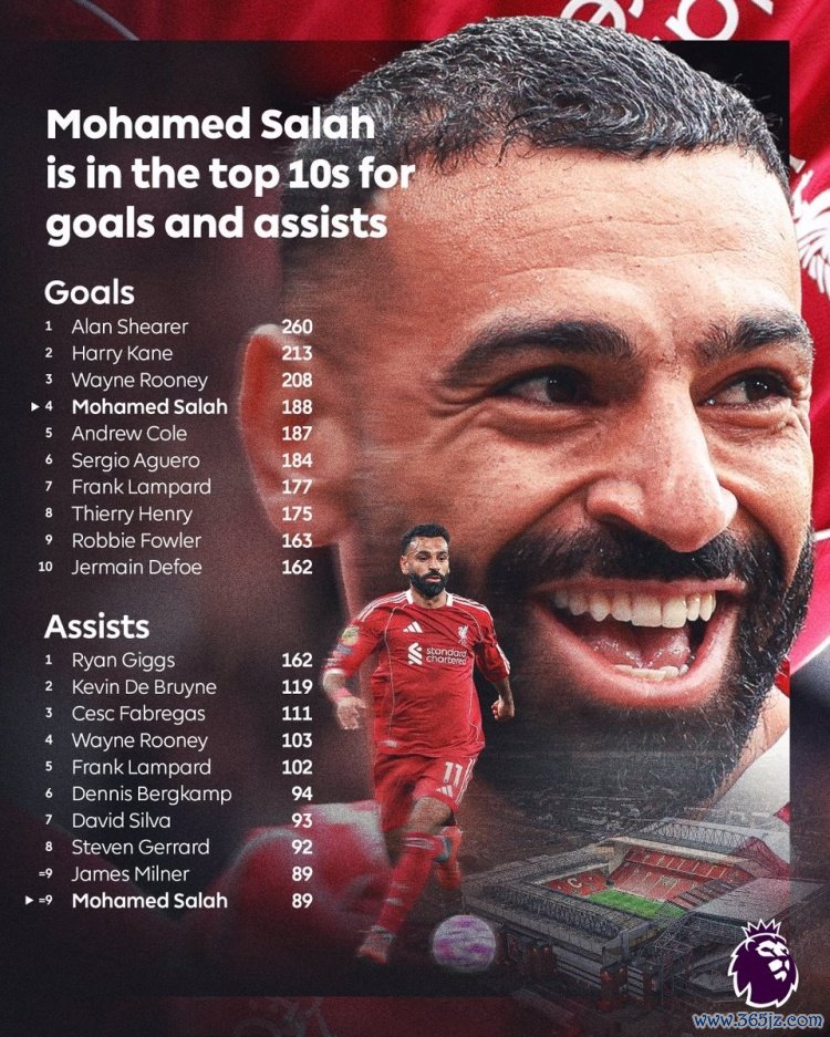 188球+89助功 !萨拉赫位列英超历史射手榜第四、历史助功 榜第九