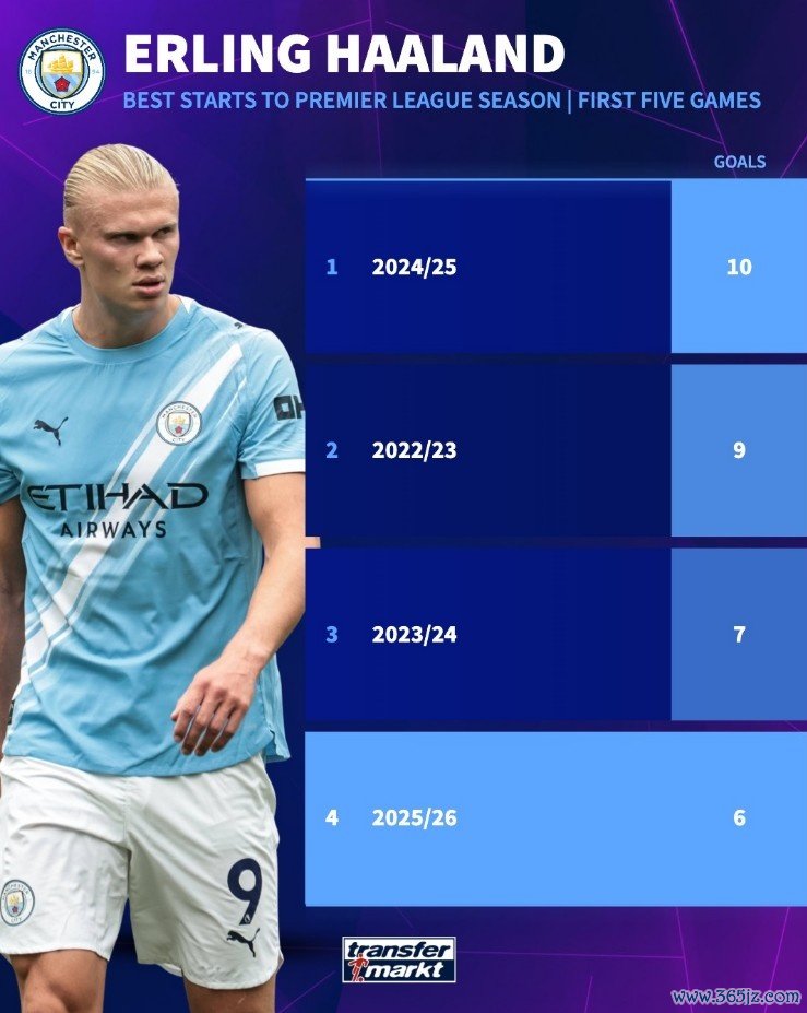 哈兰德本赛季在前5轮英超打进6球,但这已经是他加盟曼城后前5场英超最低得分 数据, 搏击资讯直播吧他在24/25赛季同期10球德甲球队名单排名, 体坛风云录22/23赛季9球,尤文图斯23/24赛季则是7球。
