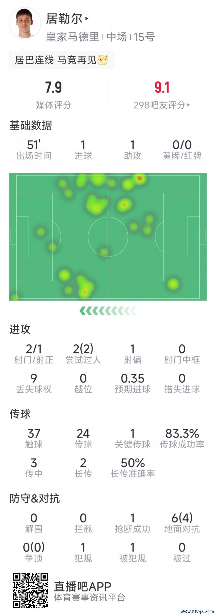 9月27日讯 本轮西甲马德里德比半场战罢,双方2-2战平,尤文图斯直播吧居勒尔传射建功。以下为他在半场数据: