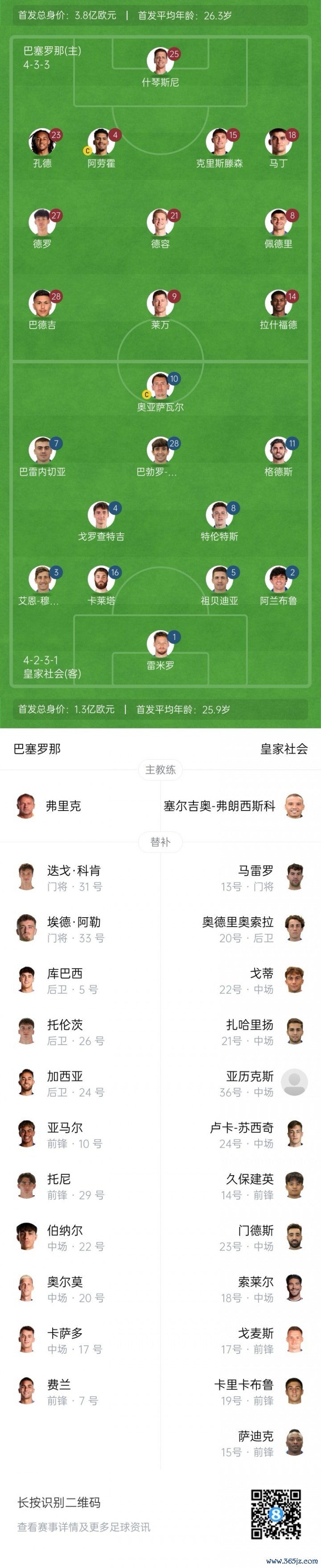 巴塞罗那后备 :31-科亨、5库巴西、33-埃德尔·阿勒、26-托伦茨、24-埃里克·加西亚、22-伯纳尔、29-托尼·费尔南德斯、7-费兰、10-亚马尔、17-卡萨多、20-奥尔莫