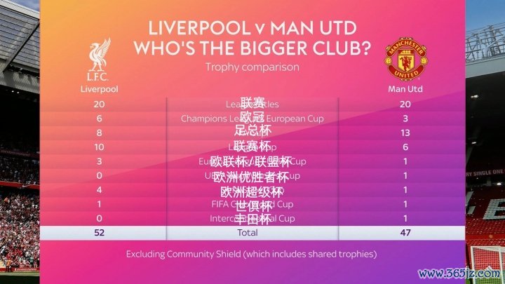 天空体育列举出了两家豪门的第一名 数对比, 体坛风云录顶级职业联赛 第一名 均为20个,尤文图斯英超直播欧冠利物浦占优(6比3), 搏击资讯足总杯方面曼联占优(13比8)。