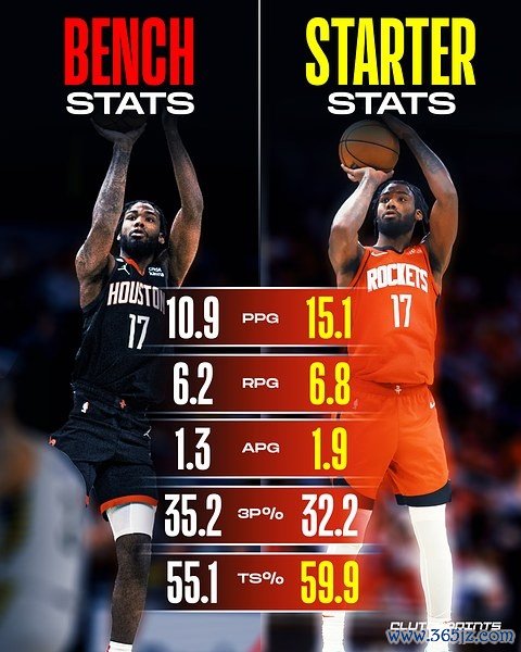 9月30日讯 美媒Clutchpoints晒出了火箭球员塔里-伊森上赛季打先发和打后备 时的数据对比。