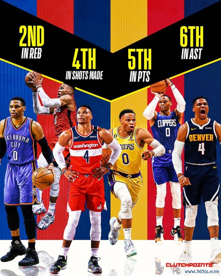 威少数据后场球员历史排名:篮板球 第二 得分 数第四 积分 第五 助功 第六