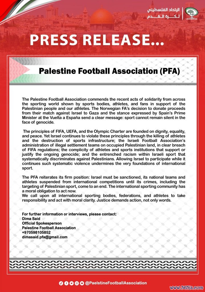 巴勒斯坦足协重申坚定立场:必须对以色列实施制裁,中止 其国家队及运动活动 员参加国际赛事资格,直至其针对巴勒斯坦体育界的暴行在内的所有罪行终结。国际体育界有道义有责任立即采取行动。