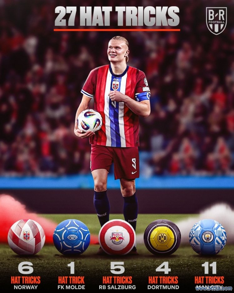 10月12日讯 世预赛欧洲区赛事 ,哈兰德打进3球, 搏击资讯体育直播帮助挪威主场作战 5-0大胜以色列。据brfootball统计, 体坛风云录哈兰德职业生涯至今已经27次戴帽(包括得分 超过3粒)。