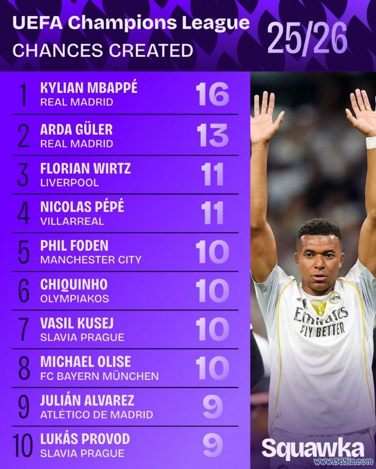 10月23日讯 Squawka统计了本赛季欧冠目前为止的创造机会排行榜,姆巴佩位列第一,尤文图斯体育直播队友居莱尔第二,