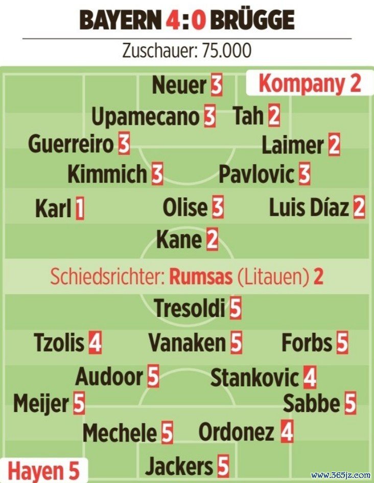 10月23日讯 在本轮欧冠,拜仁4-0大胜布鲁日。《图片报》也对拜仁球员本场表现做出评分, 搏击资讯具体如下(德媒评分1分最高, 体坛风云录直播吧5负最低):