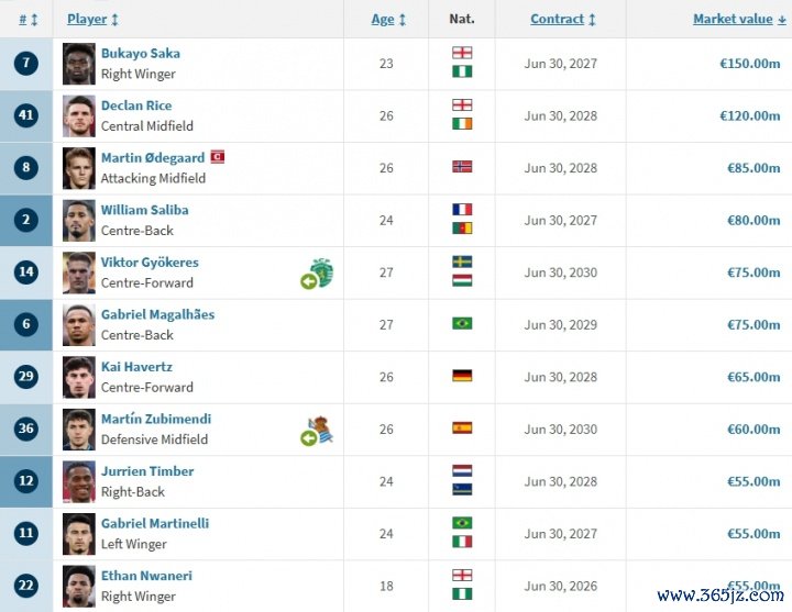 阿森纳队内身价排名:约克雷斯7500万空降第五,萨卡、赖斯破亿
