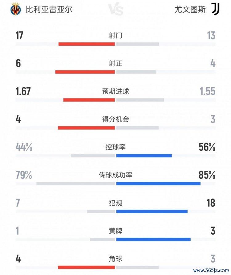 比利亚雷亚尔vs尤文数据:射球 17比13、射正6比4、盘带时间 44%比56%